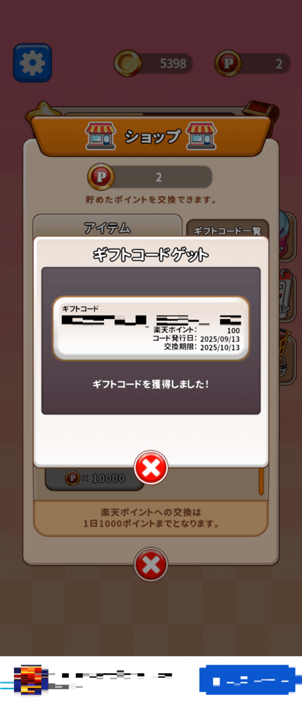「楽天ポイントに交換しますか?」と表示されるので、「はい」をタップするとギフトコードが発行されます。