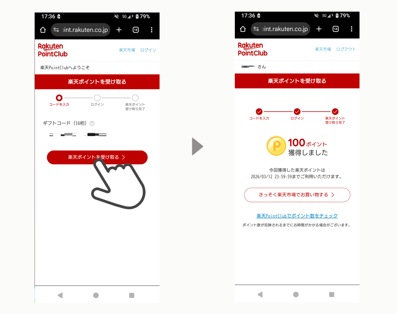 ギフトコードをタップすると、楽天ポイント受け取り画面に移動します。