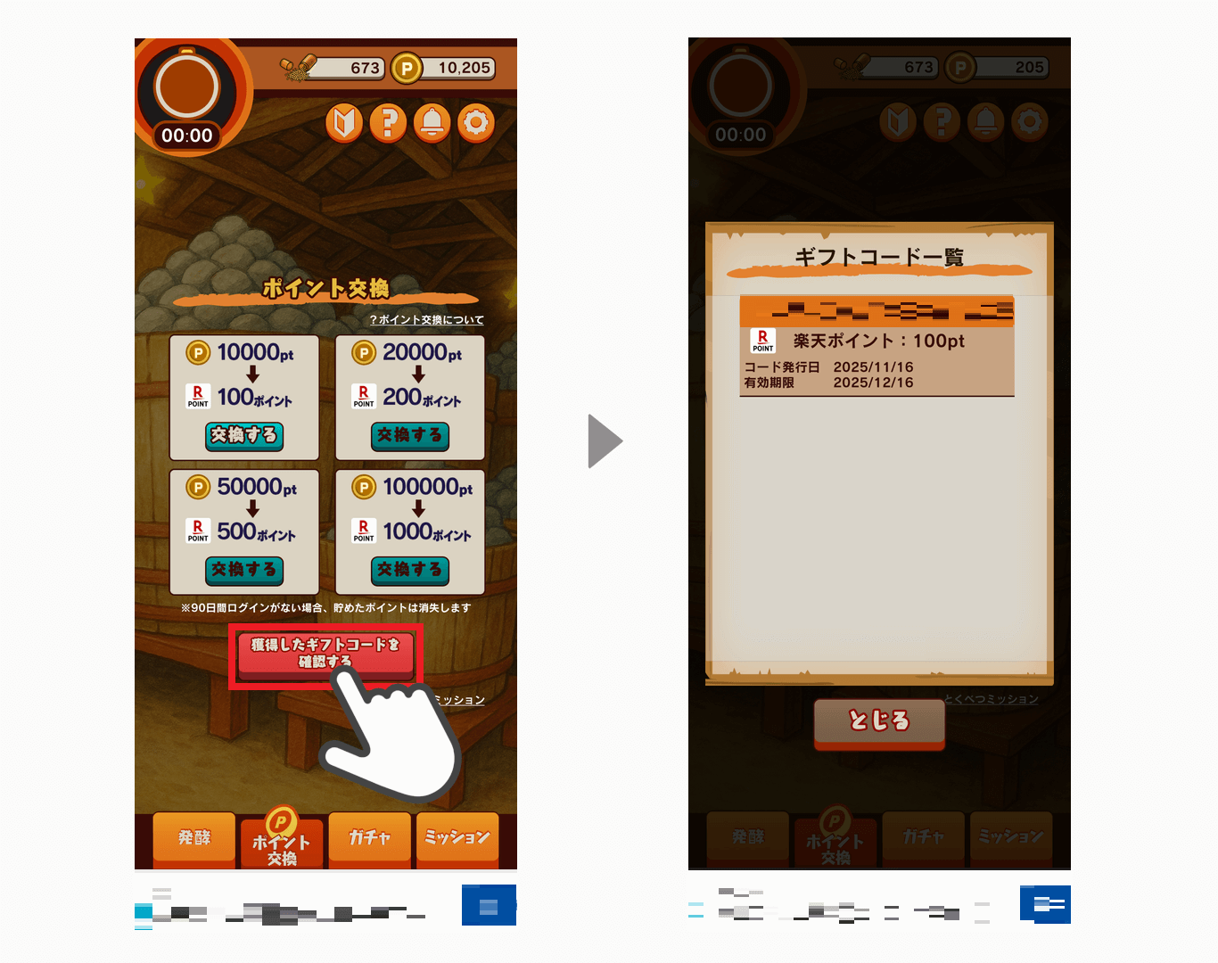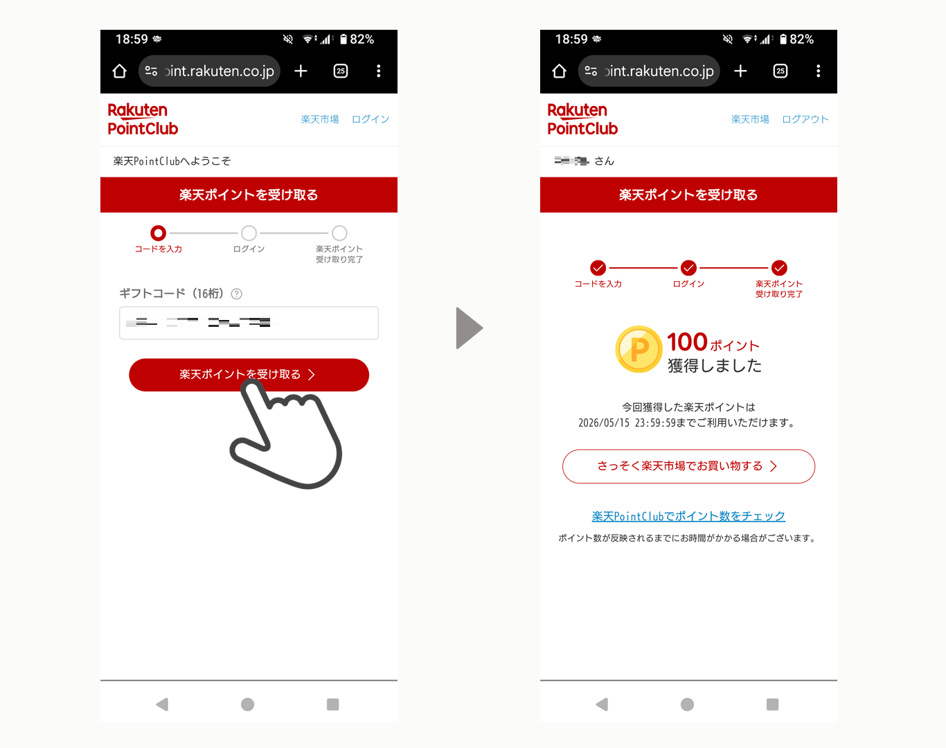 ギフトコードをタップすると、楽天ポイント受け取り画面に移動します。